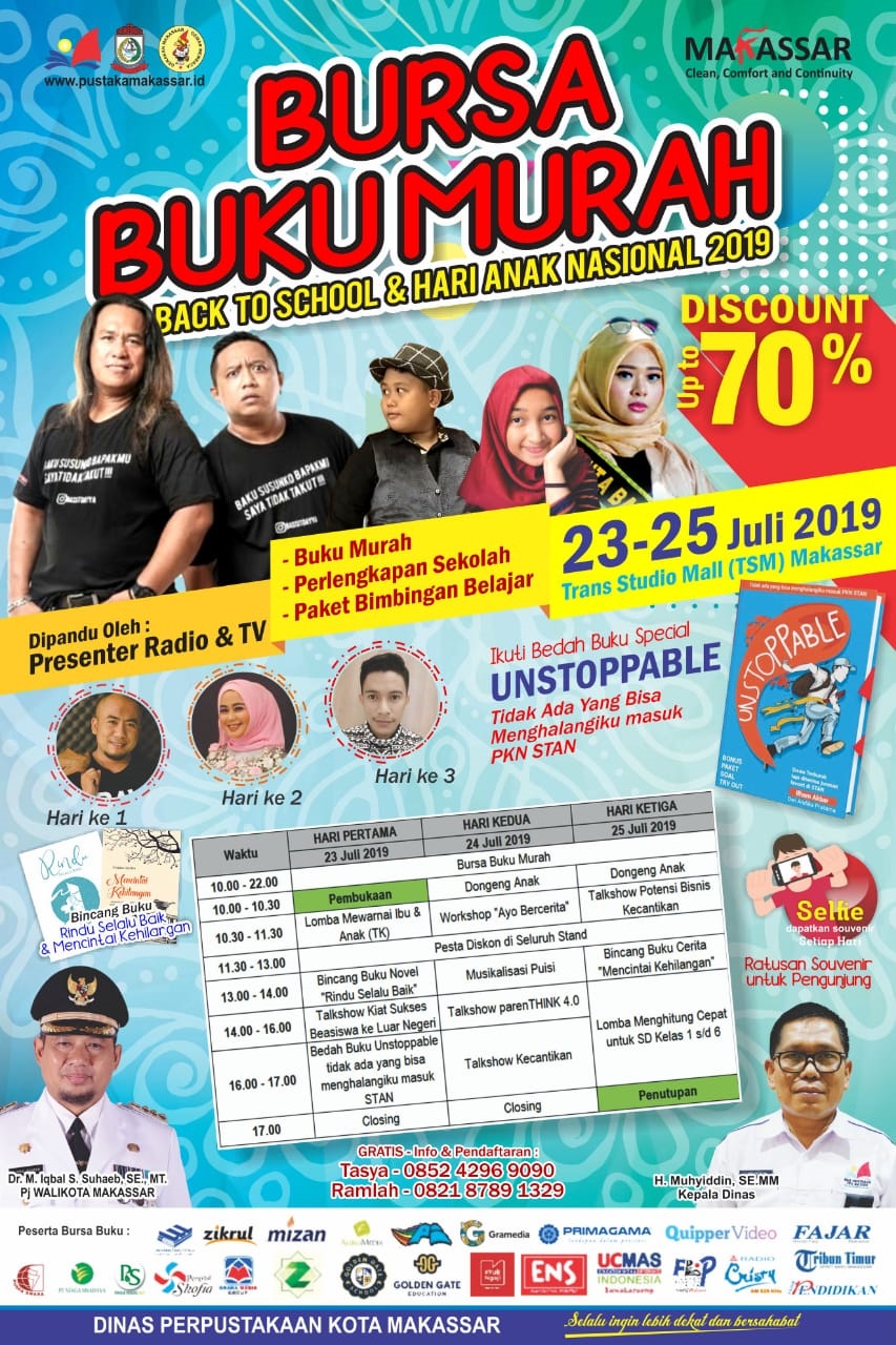 Bursa Buku Murah (BBM) program Dinas Perpustakaan Makassar datang lagi. Yuk datang dan ikuti berbagai kegiatannya hanya 3 hari saja, 23–25 Juli 2019 di Trans Studio Mall (TSM) Makassar. Dapatkan berbagai buku murah diskon hingga 70%, perlengkapan sekolah dan paket bimbingan belajar spesial. Info lebih lanjut hubungi kontak person di Poster.
